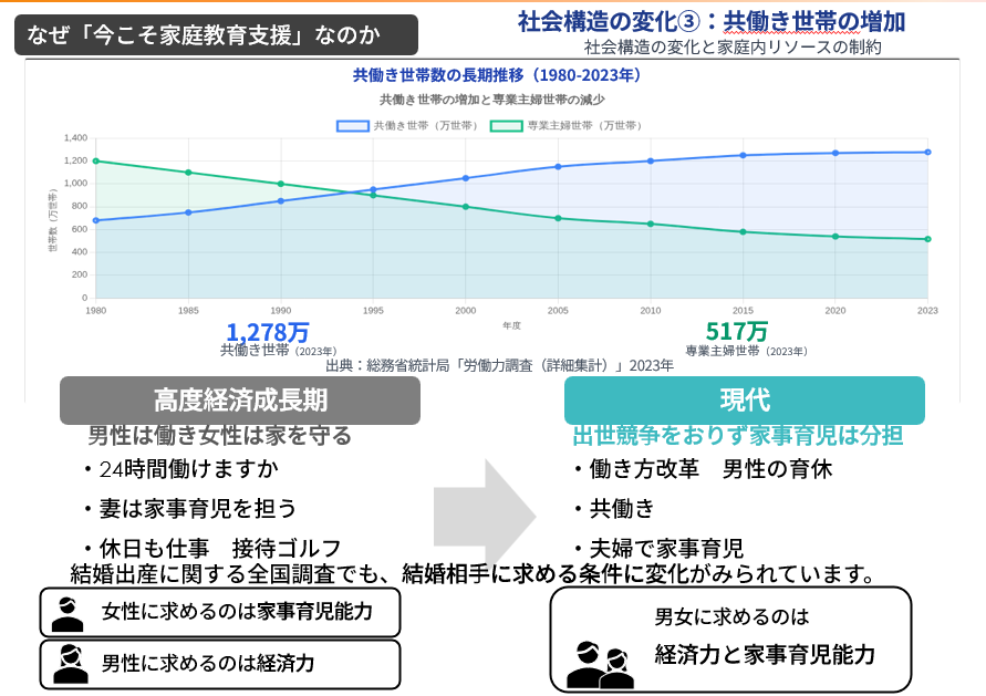 図にあるように、共働き世帯が増加している昨今、かつ核家族化が進み、近くに助けてくれる人がいない状況での子育てで悩まれているお母さんがたくさんいらっしゃるというお話をしたのですが、今回1期めの先生が多かった(つまり私と年齢が近い先生が多かった)ため、うんうんと頷いてお話を聴いてくださる先生が多かったです。