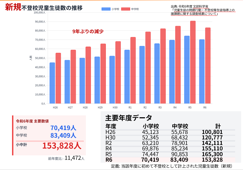 また、現状、不登校児童生徒数は増加しておりますが、最新データでは新規不登校児童生徒数の発生は減少しました。
