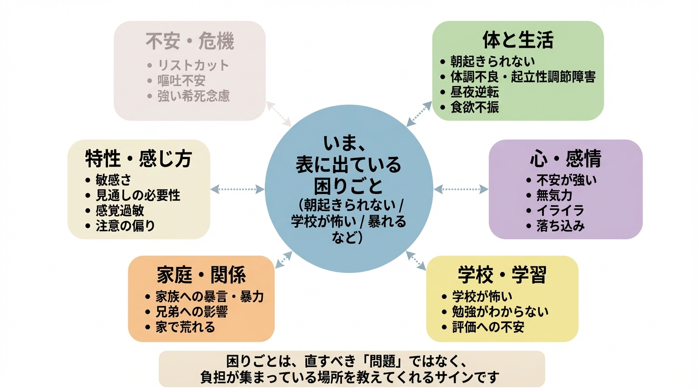 ここでは、困りごとを「直すべき問題」ではなく、いま起きている負荷を知るための手がかりとして整理します。
